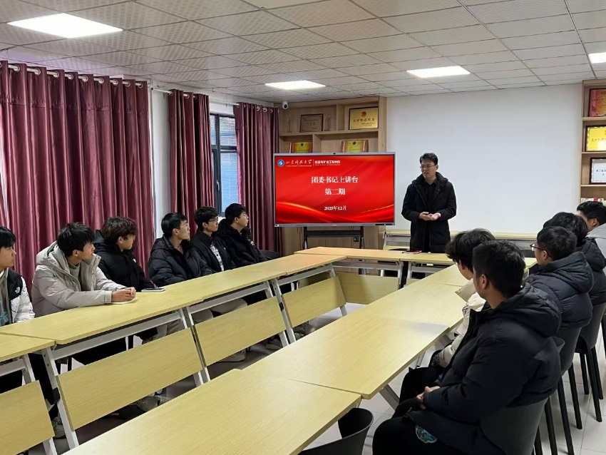 12月11日下午,能源学院团委书记周尚涛走进学院“一站式‘学生社区’嘉源驿站”,在“思享汇”教室为能源学院学生会成员讲授了一堂主题鲜明、内涵丰富的团课。。