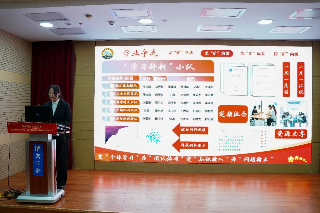 智能采矿工程2024-2班始终坚持以传承“老矿院精神”为主线,系统构建“一个核心引领、三支骨干队伍、五个学创小队、六个建设工程”的育人体系,形成“1+3+5+6>30”的学风建设合力,引导学生自觉践行“十五五”规划建议中首次提出的“能源强国”战略。班级创新设立“思政+学术+产业”三维导师团,打破传统仅按成绩划分的学习小组模式,依托导师科研方向,组建5支“学创小队”,推动课堂学习向科技创新延伸。各小队围绕竞赛培育与产业实践开展项目孵化,通过“周总结、月汇报”的常态化研讨机制,实现理论学习与实践创新的深度融合。