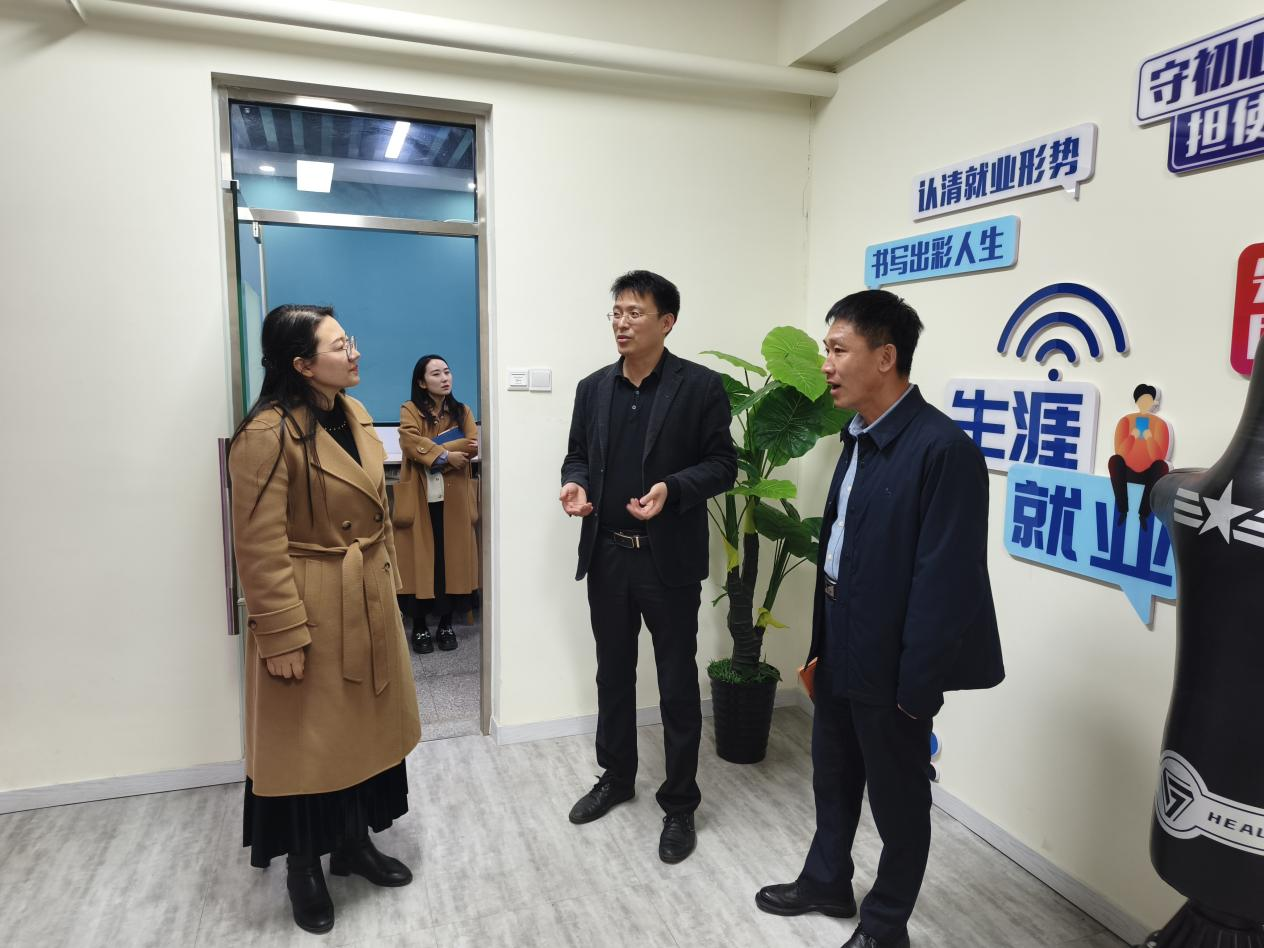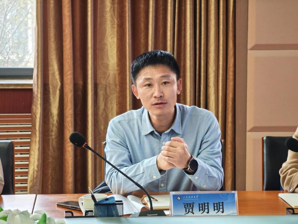 周尚涛对贾明明一行来访表示热烈欢迎,并介绍了学院基本情况以及辅导员队伍情况。他以《锻造红墨思政引领力,答好教育强国核心题》为题,重点围绕学院立德树人机制综合改革试点院系建设工作,从学院党建双创引领、立德树人建设、创新创业教育、一站式社区建设等方面作详细汇报。