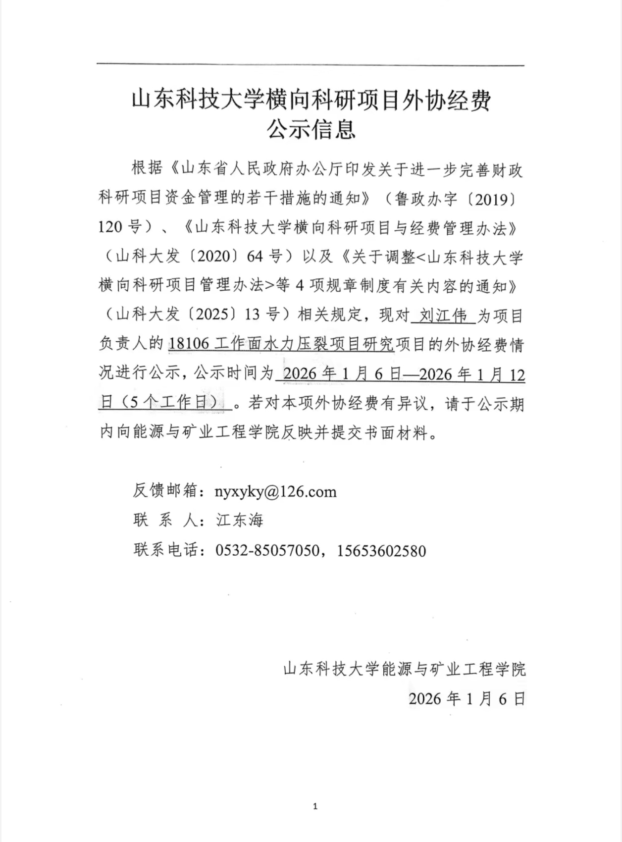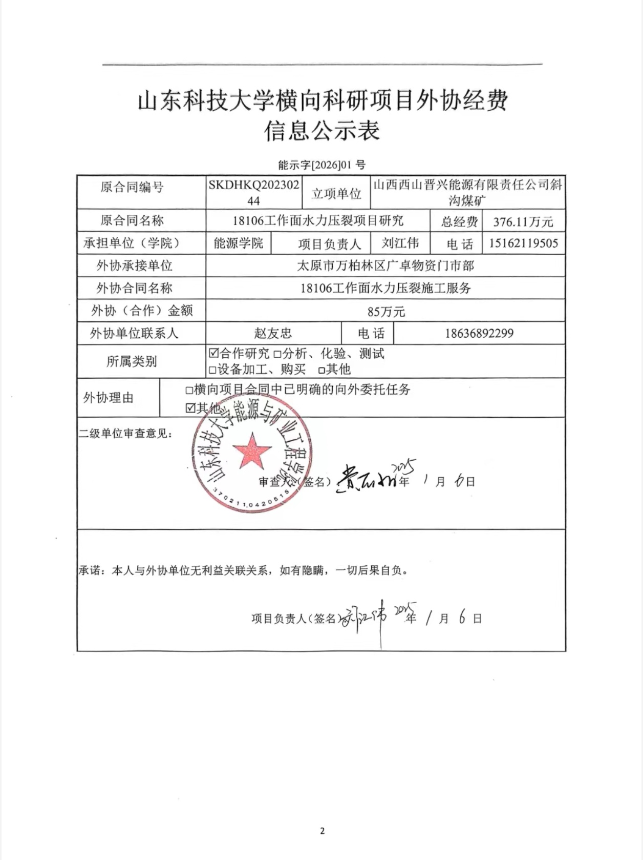 山东科技大学横向科研项目外协经费公示信息