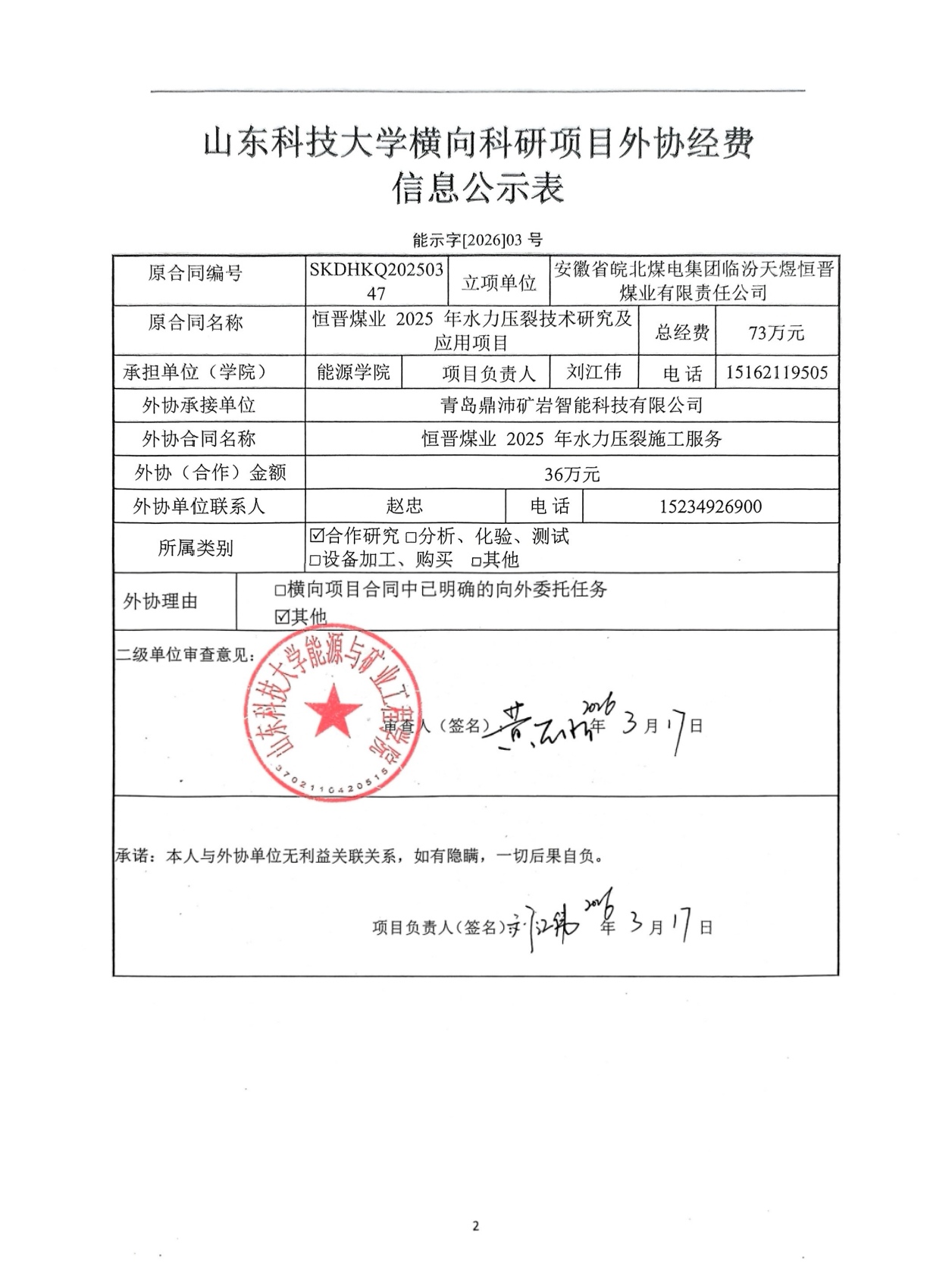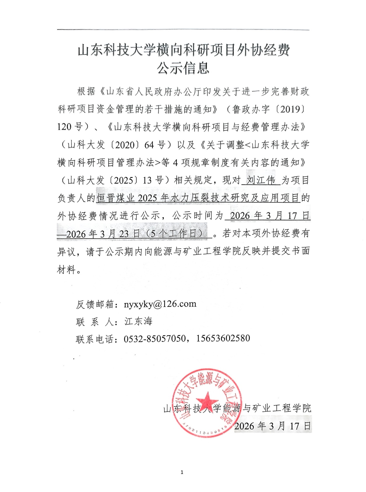 山东科技大学横向科研项目外协经费公示信息