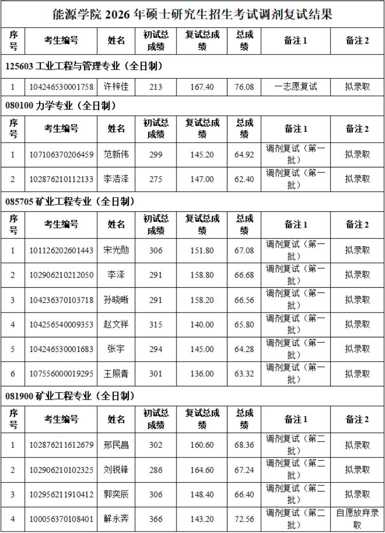 根据《山东科技大学2026年硕士研究生复试录取工作方案》《山东科技大学能源与矿业工程学院2026年硕士研究生复试录取工作实施细则》要求,我院组织完成2026年硕士研究生招生考试调剂复试(第二批),现将结果予以公示(名单附后)。