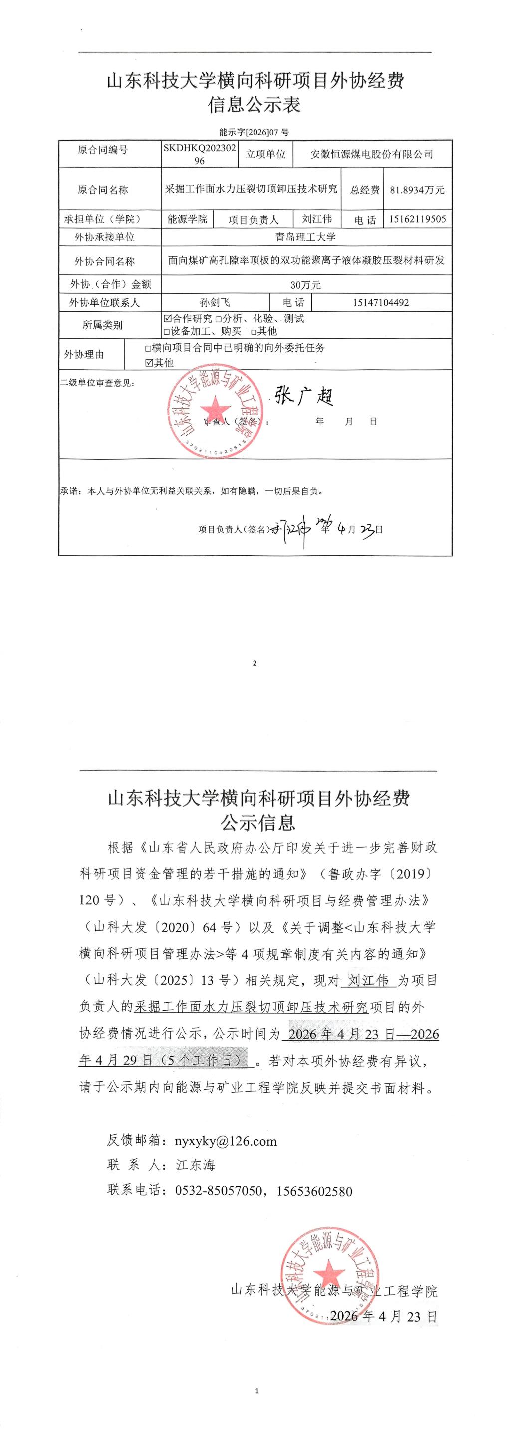 山东科技大学横向科研项目外协经费公示信息
