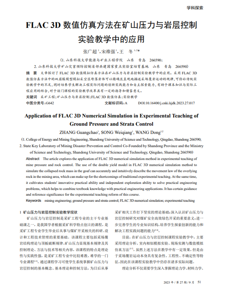 FLAC 3D 数值仿真方法在矿山压力与岩层控制 实验教学中的应用